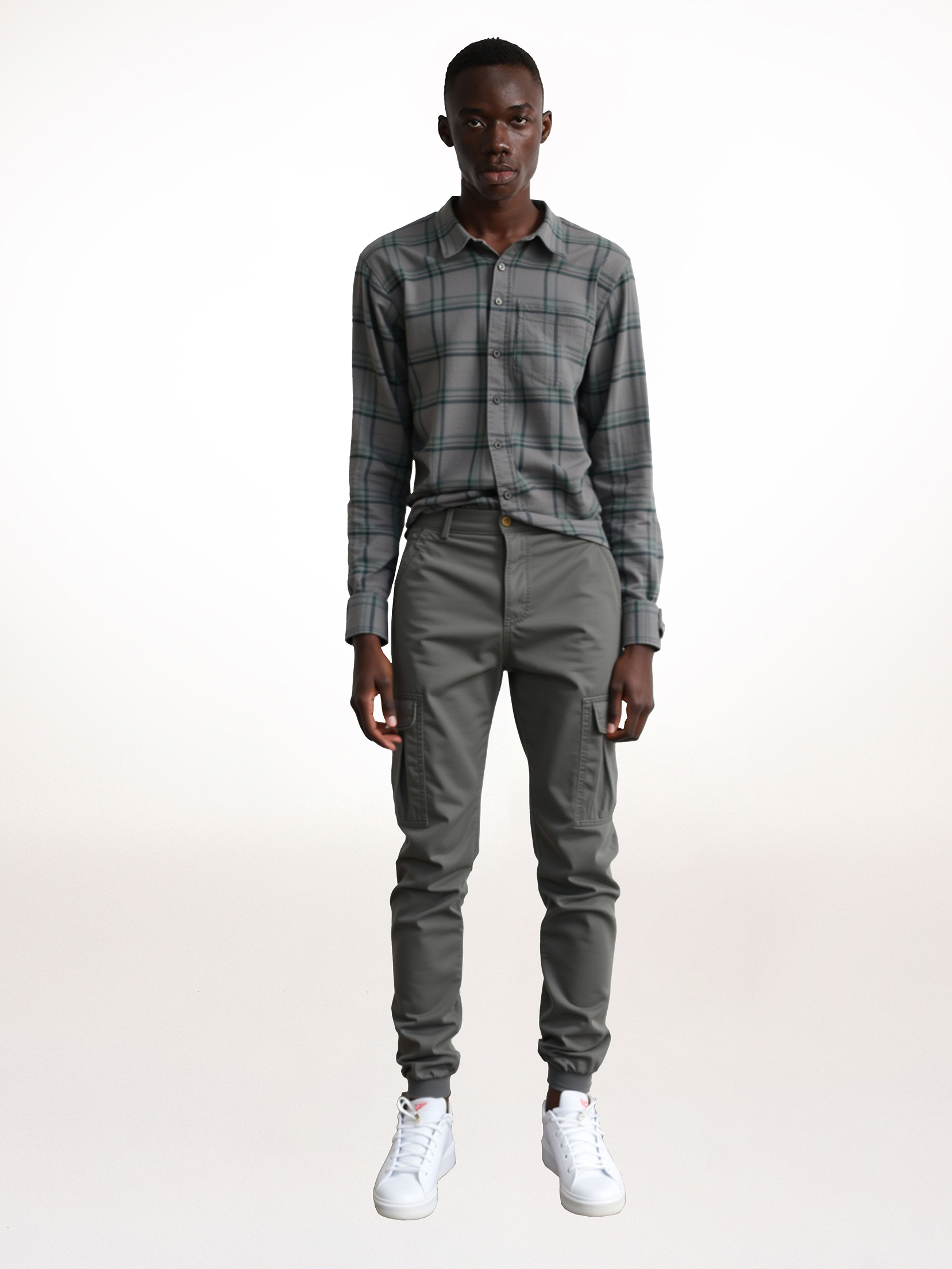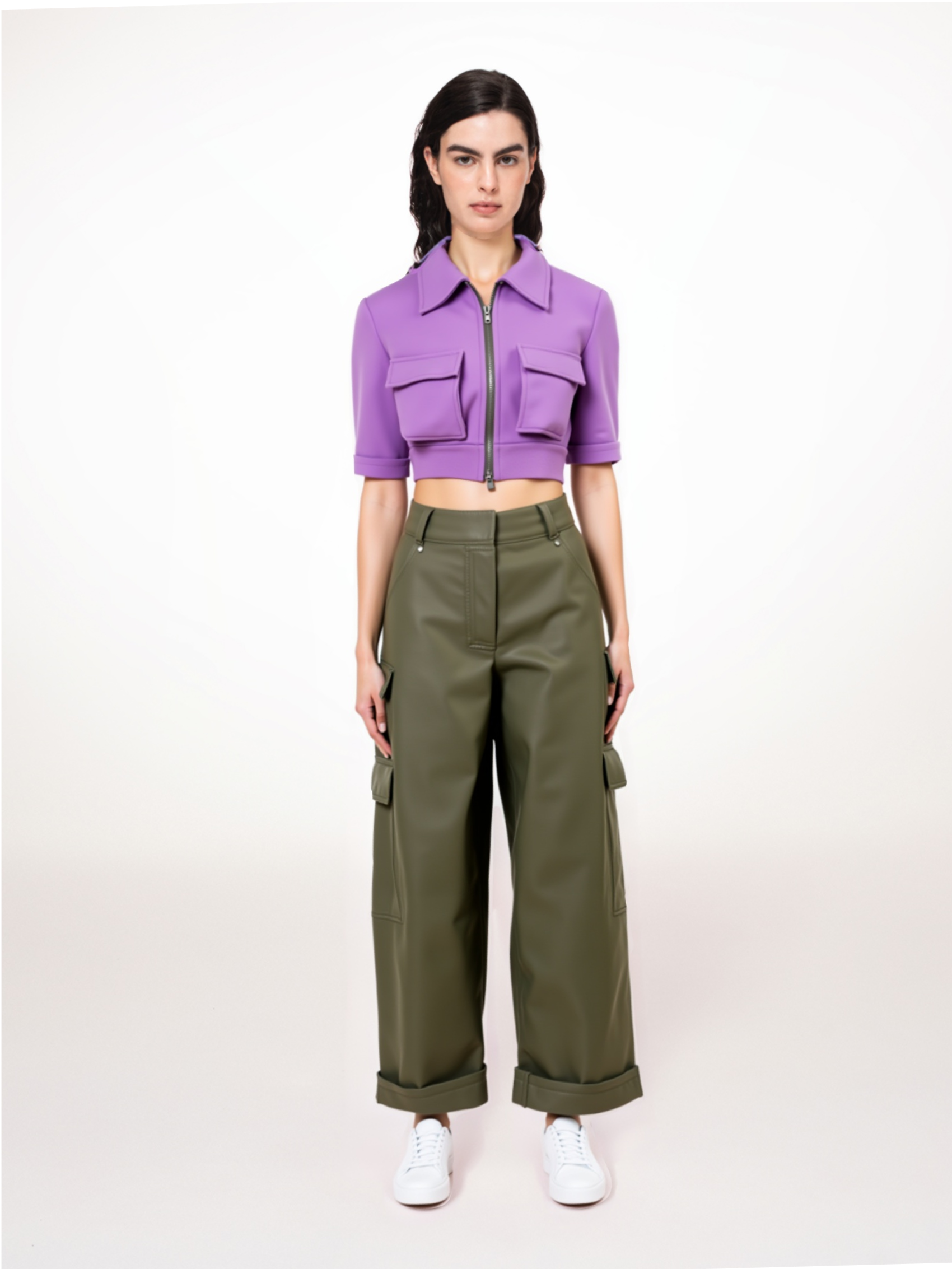 Cropped lilac zip-up jacket with a structured collar and short sleeves, high-waisted olive green pants featuring multiple flap pockets, white sneakers.