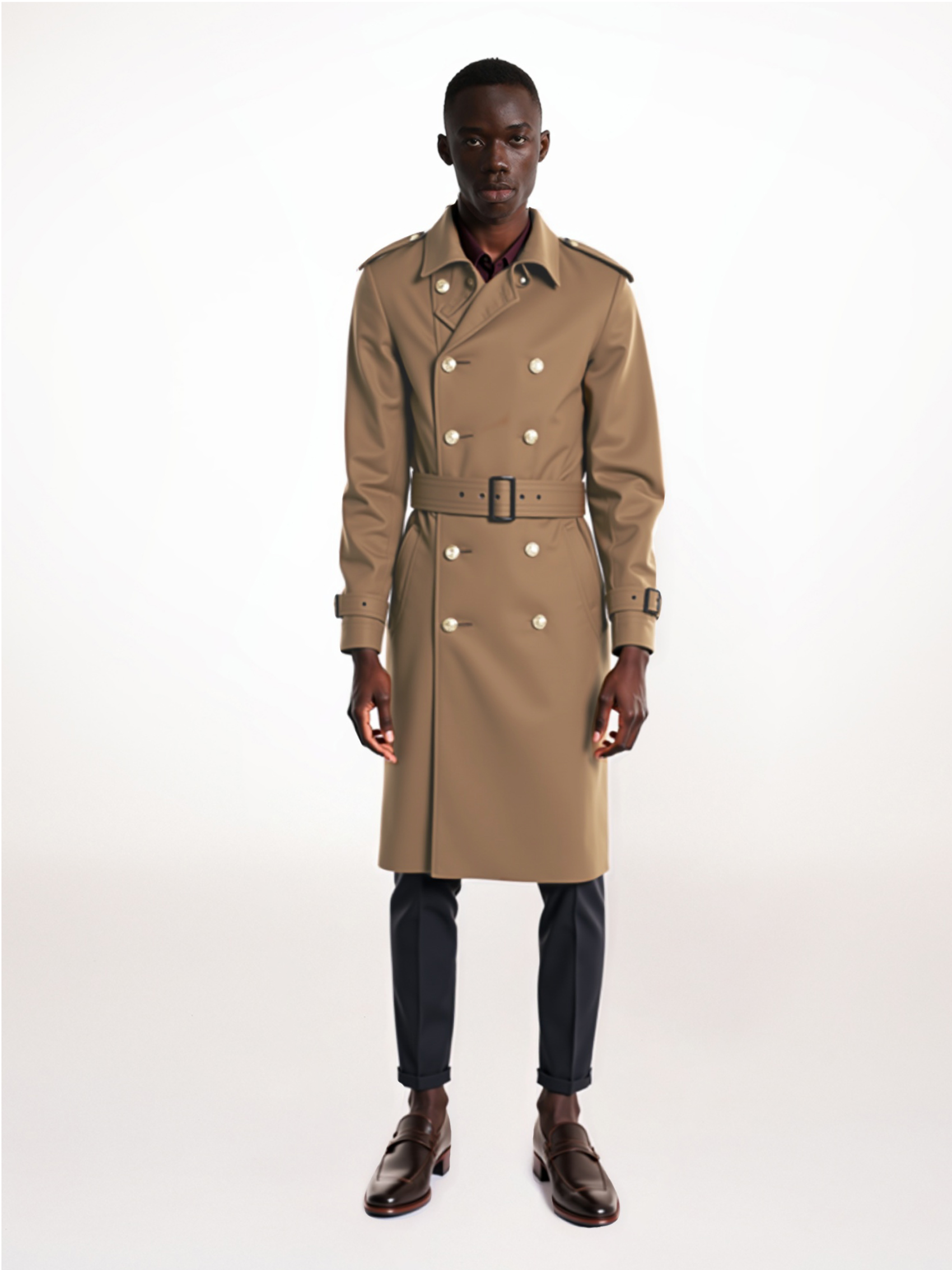 Classic men's beige trench coat with double-breasted gold buttons, belted waist, skinny pants, brown loafers.