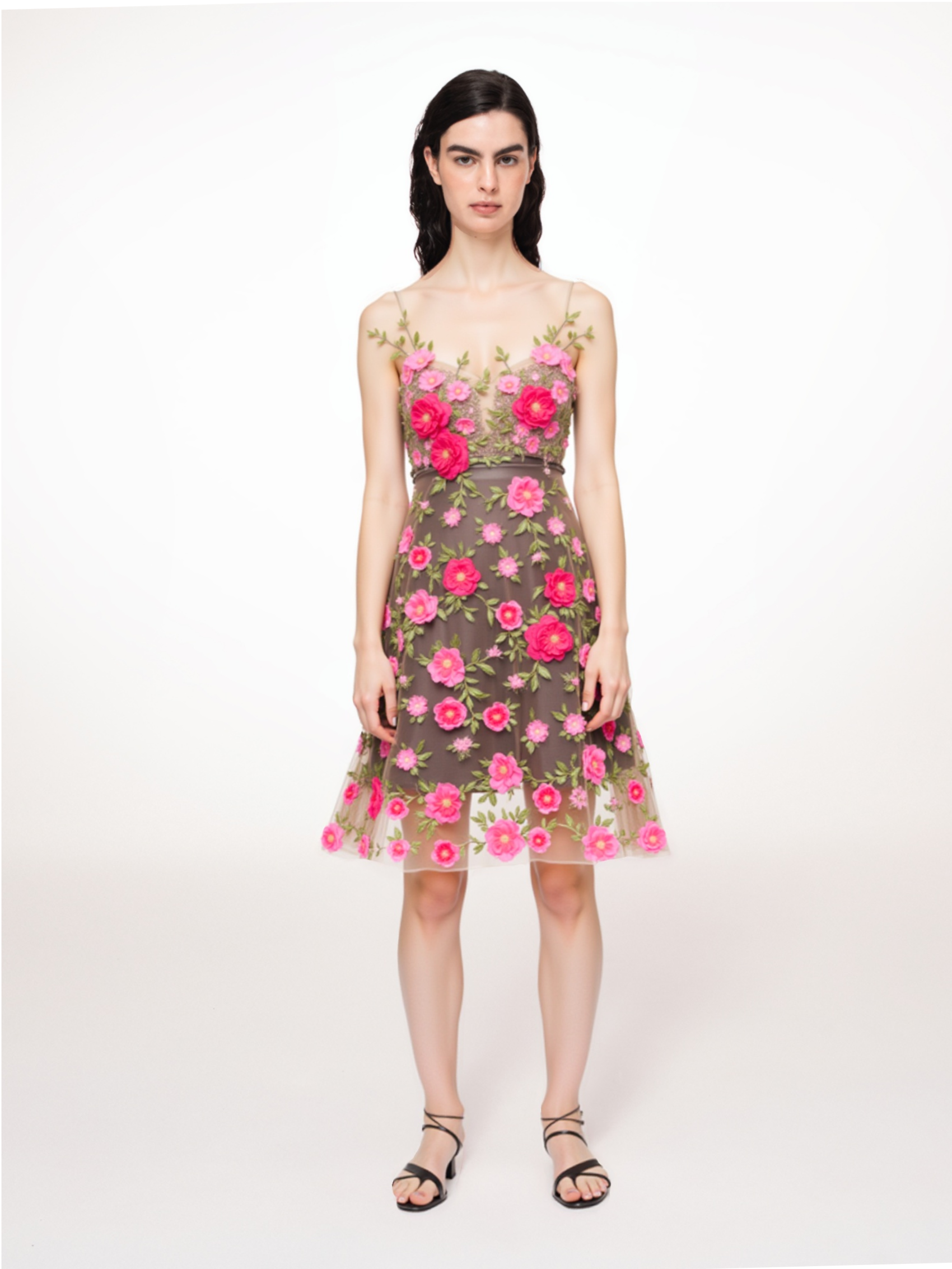 Sheer midi dress with vibrant 3D floral embroidery, fitted silhouette, delicate illusion neckline, black strappy high-heel sandals.