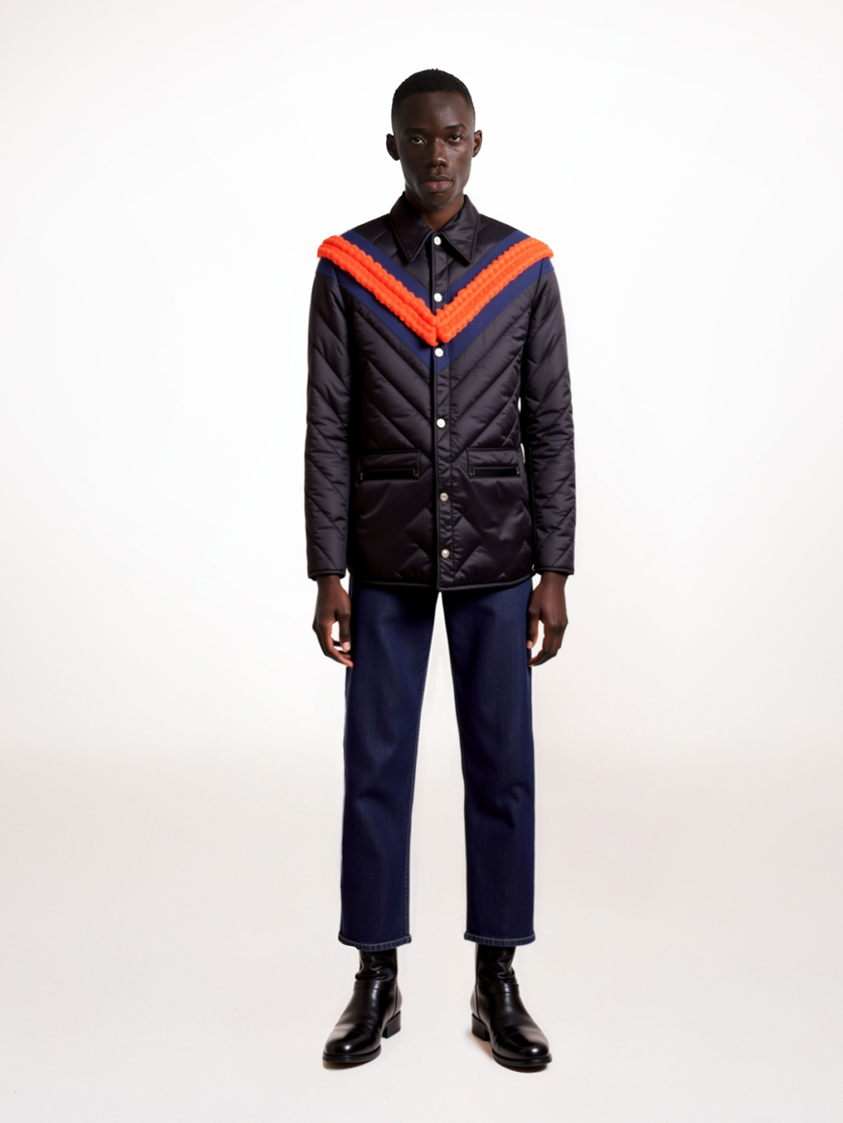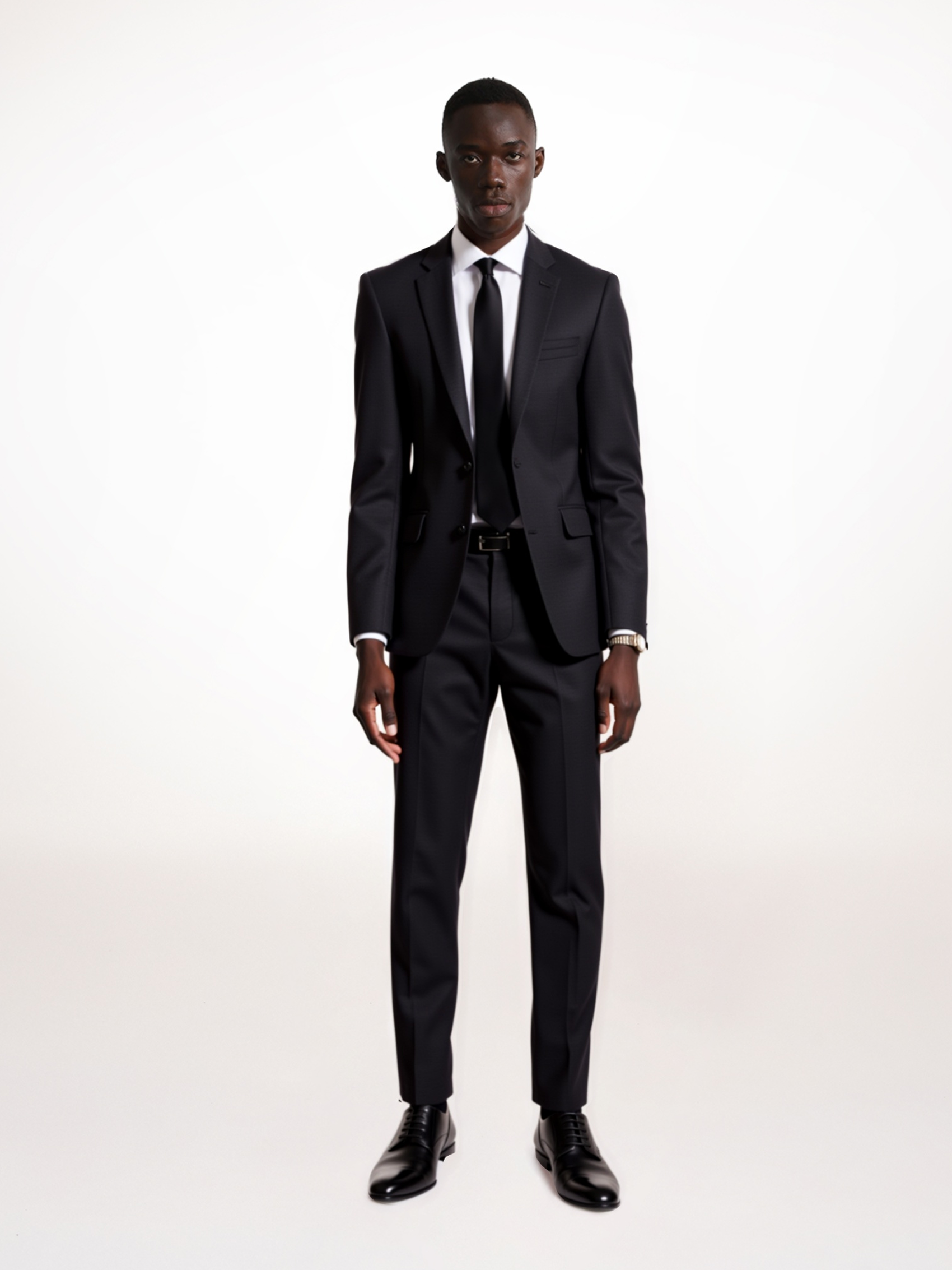 Black wool suit, slim-fit, white shirt, leather shoes, golden watch.