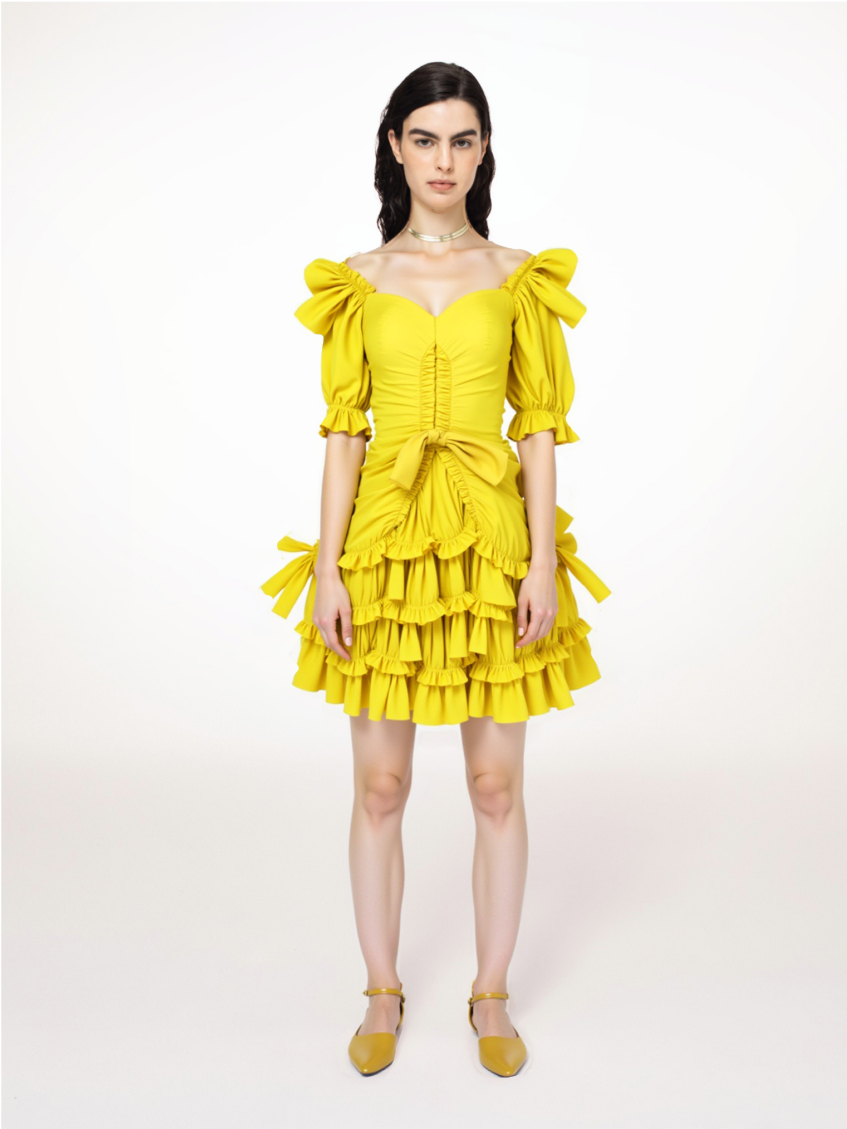 Vibrant yellow ruffled mini dress with puffed shoulders, sweetheart neckline, three-quarter sleeves, and a cinched waist with a bow detail.